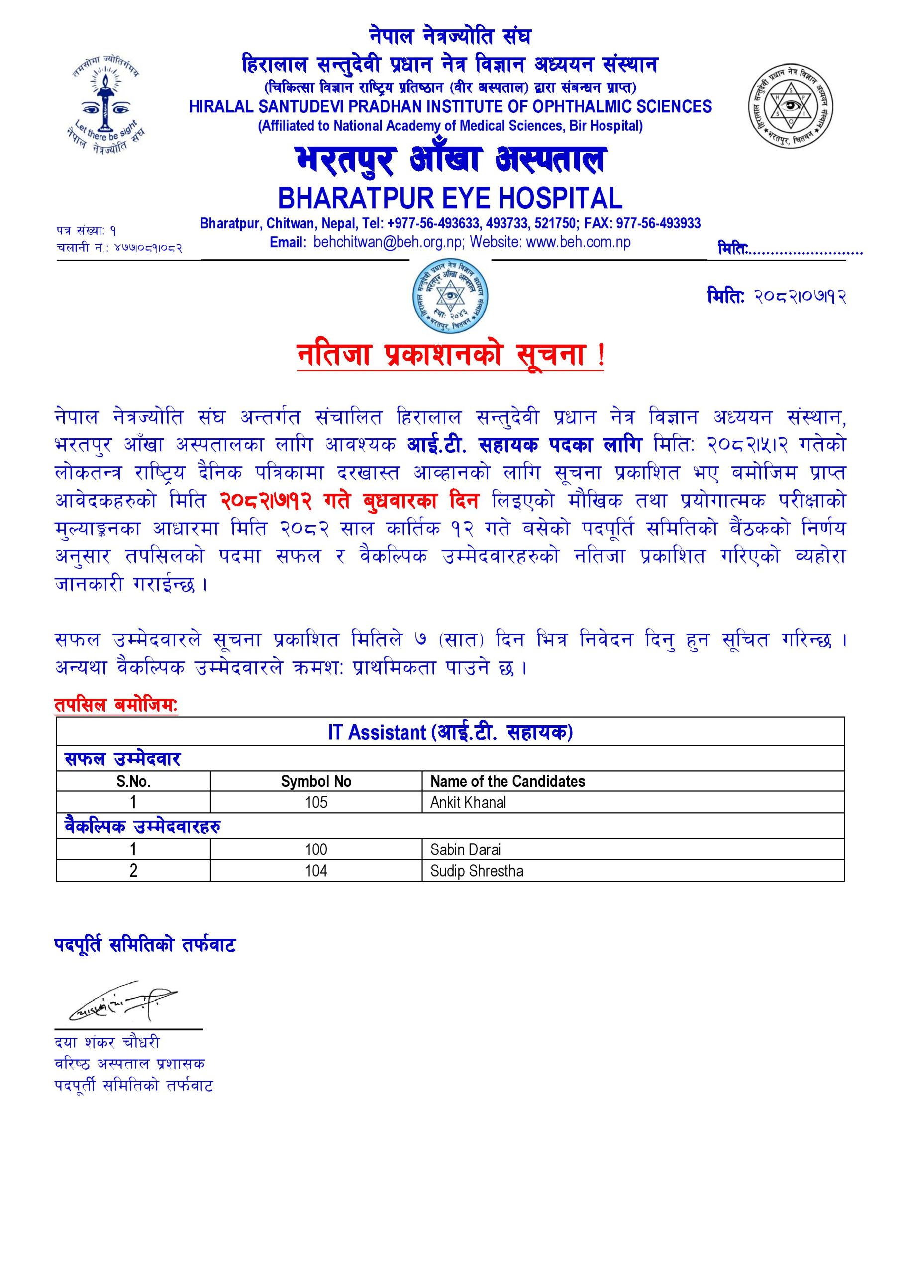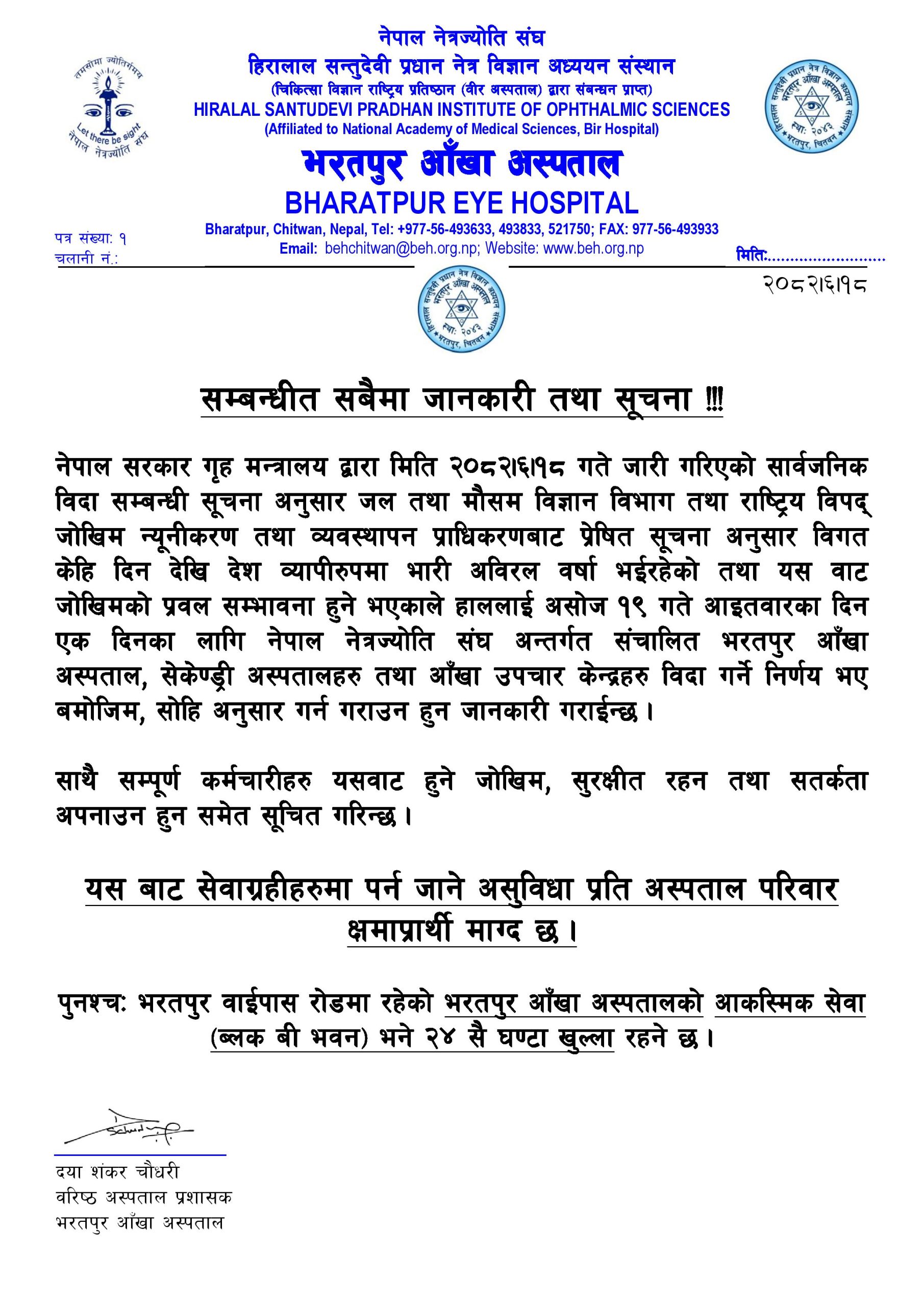 Bharatpur Eye Hospital which is located in Chitwan district of southern central Nepal, is a non-profit charitable organization, providing high quality comprehensive eye care services at affordable cost to local as well as patients.