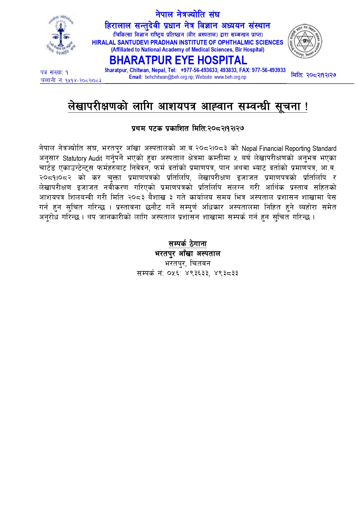 Bharatpur Eye Hospital was established in 1987 under the aegis of Nepal Netra Jyoti Sangh (NNJS-