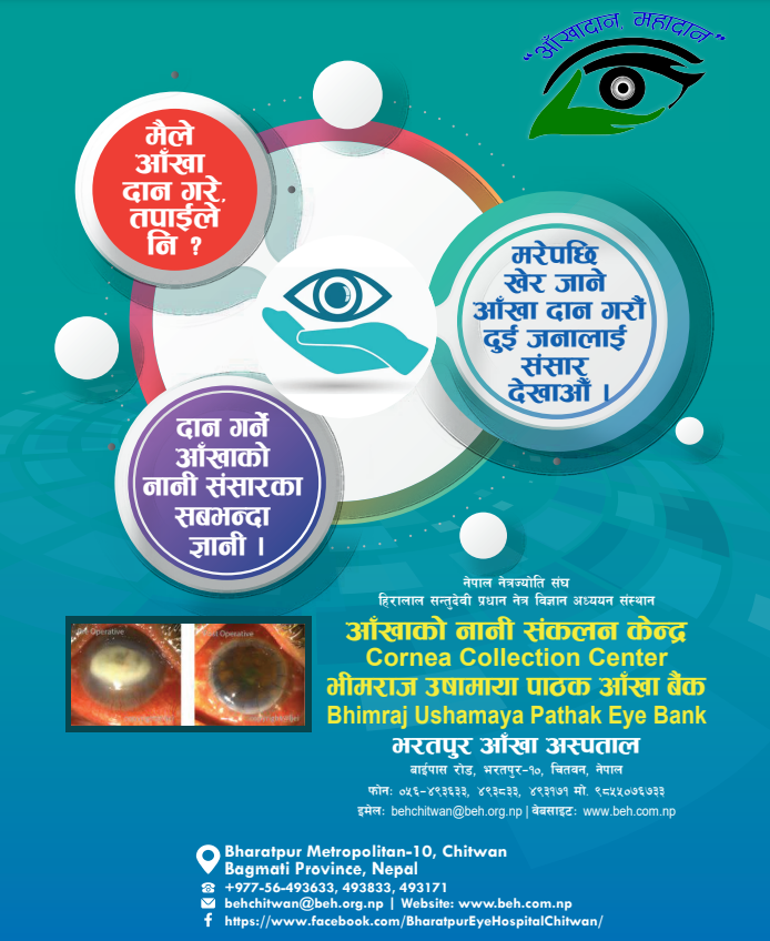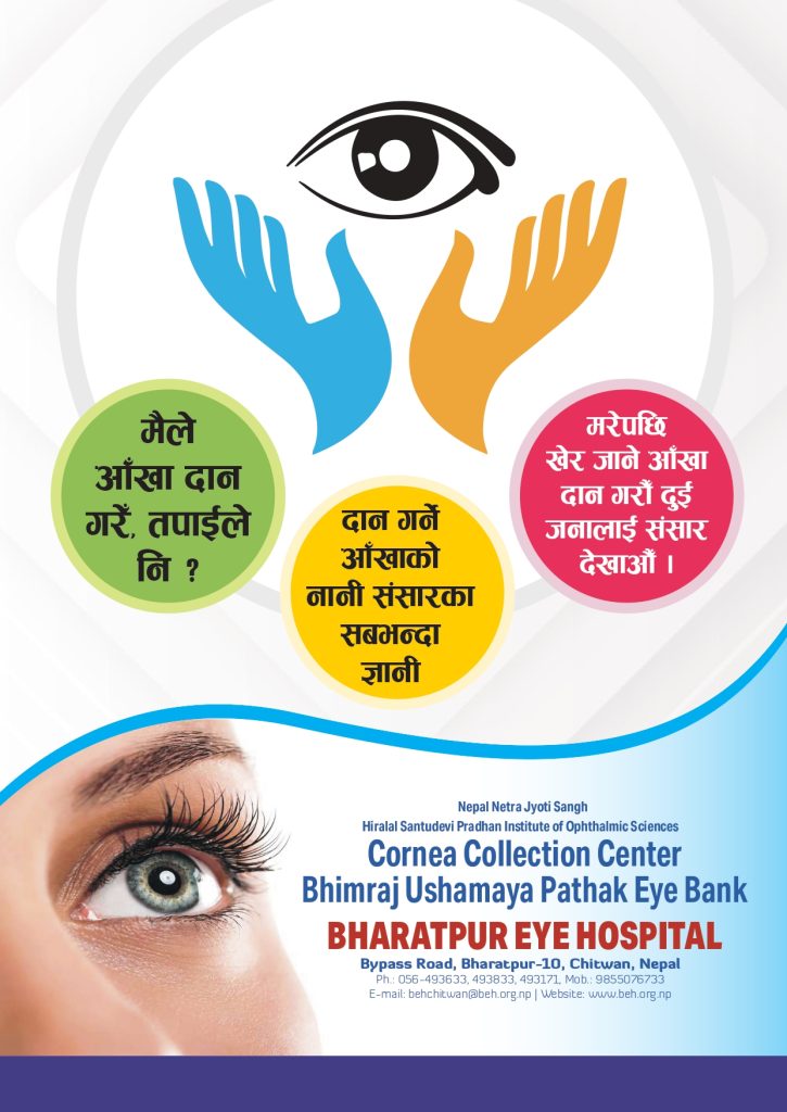 To combat corneal blindness, Bharatpur Cornea Collection Centre was started onĀ in co-operation with Nepal Eye Bank (Tilganga Eye Centre) and NNJS-C. The centre provides eye donation willingness forms.
