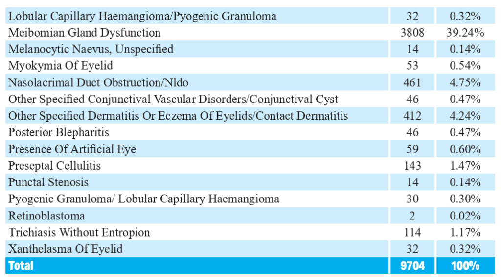 It has facilities for green laser photocoagulation with additional facility of indirect laser Ophthalmoscopy. Also, the department of investigative ophthalmology includes a swept source OCT with OCT angiography along with fundus photography, Fundus Fluorescein Angiography (FFA) and high resolution ultrasound B-scan to support diagnosis and research in the department. In terms of data, the patient flow averages 50-60 per day presently. Out of 10822 medical record entries related to retina,diabetic Retinopathy, Age related Macular Degeneration and retinal venous occlusions are the most common retinal conditions.