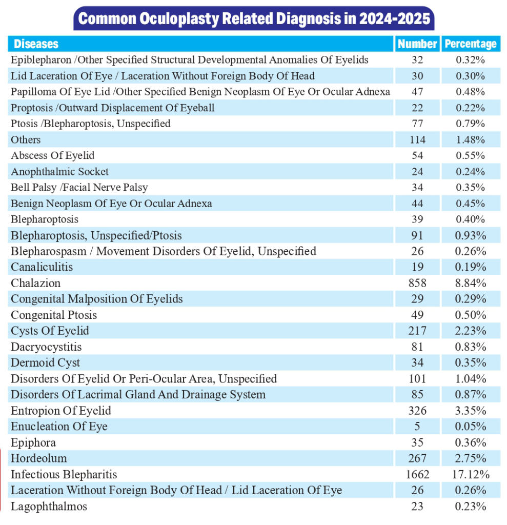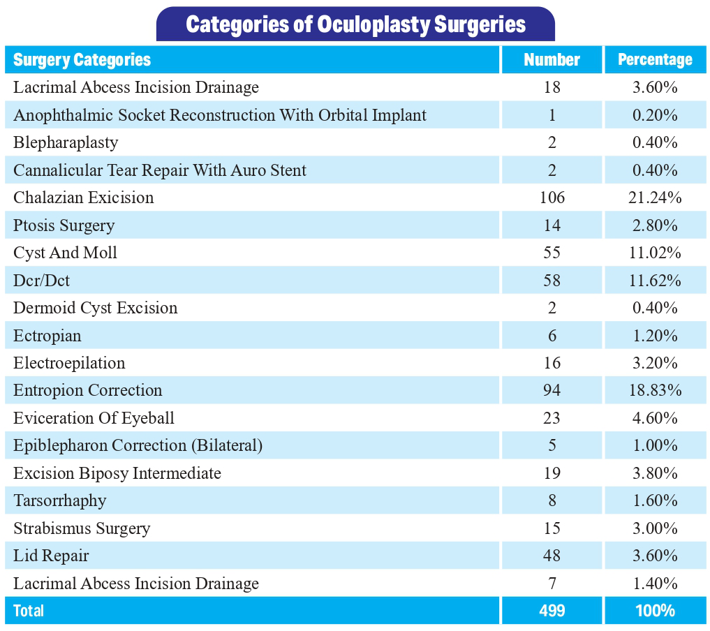The Oculoplasty Department at Bharatpur Eye Hospital is a dedicated subspecialty unit focused on the diagnosis and management of disorders affecting the orbit, eyelids, tear drainage system, and ocular adnexa. The service is currently provided by two experienced oculoplasty surgeons, offering specialized care to patients with both functional and aesthetic needs. Common procedures performed include chalazion excision, entropion correction, and dacryocystorhinostomy (DCR), addressing a wide spectrum of lid and lacrimal system disorders. With the establishment of this subspecialty, the department strives to enhance both functional restoration and cosmetic outcomes, particularly for individuals who have undergone enucleation or eye loss, thereby supporting improved rehabilitation and quality of life. During the fiscal year, a total of 3,292 patients were registered under the Oculoplasty Department, reflecting its growing role in comprehensive ophthalmic care