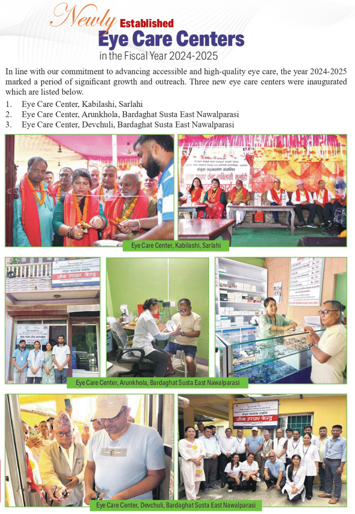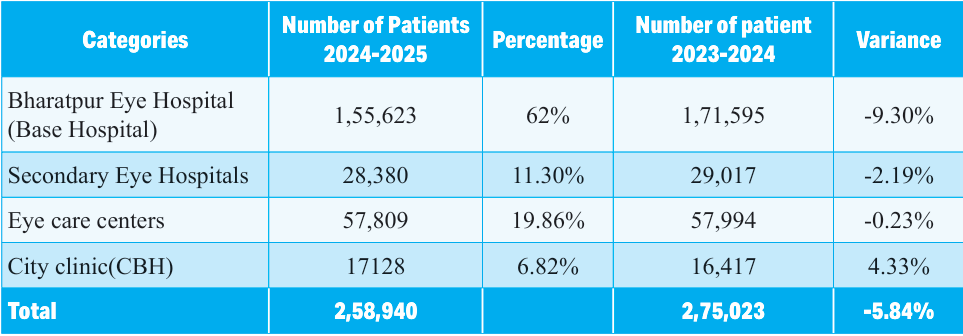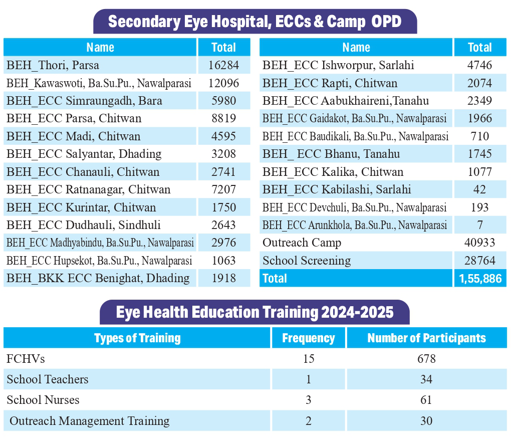 To extend quality eye care services to underserved populations, Bharatpur Eye Hospital (BEH) operates a robust service network comprising two secondary eye hospitals (Kawasoti and Thori) and 21 Eye Care Centers. Throughout the year, community outreach activities are conducted to ensure access for those who might otherwise remain unreached. During the reporting year, BEH organized a total of 84 Distant Screening and Treatment (DST) Camps, 24 surgical camps, 11 surgical visits, 66 school screening programs, 3 colour vision testing camps, and 3 workplace screening camps. Through these outreach initiatives, 40,933 individuals received eye care services. Notably, 4,202 sight-restoring cataract surgeries were performed via DST camps, surgical camps, and surgical visitsaccounting for 42% of the total cataract surgeries conducted during the year.