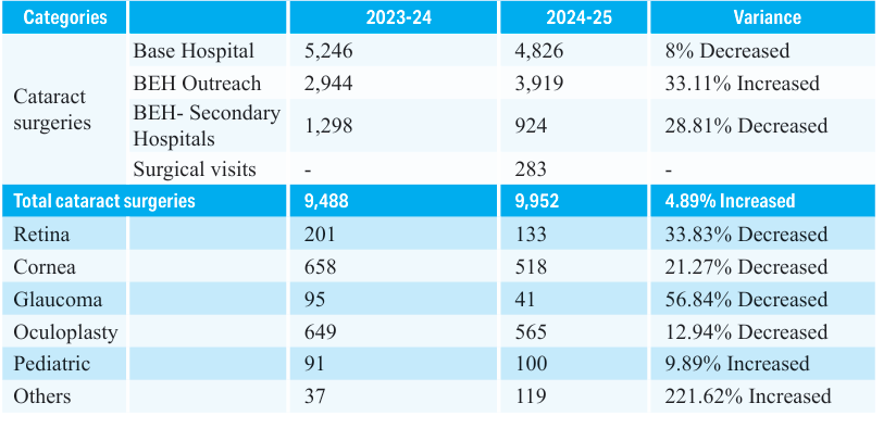 In addition to outreach, the two secondary eye hospitals served 28,380 outpatient department (OPD) patients, while the Eye Care Centers collectively provided services to 57,809 patients, reinforcing BEH’s commitment to equitable and accessible eye health across the region.