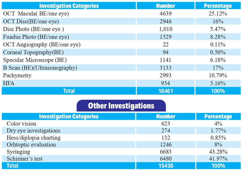 The investigative department is well equipped with almost all necessary investigative instruments for investigating different ocular conditions required for proper diagnosis and management of ocular pathology. Currently we have OCT, Fundus Camera, Corneal topography, Specular microscope, B-scan, A-scan, Keratometer, Anterior segment photography, Pachymetry etc.