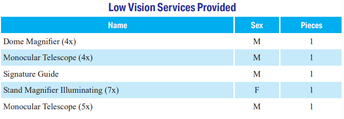 The low vision clinic is equipped with common low vision devices like monocular telescope, binocular telescope, spectacle magnifiers, and hand- held magnifiers, stand magnifiers, filters and non- optical devices. Low vision clinic has helped many patients to see better and use the residual vision to perform must needed daily activities. A total of 23 patients were provided low vision services in this year.