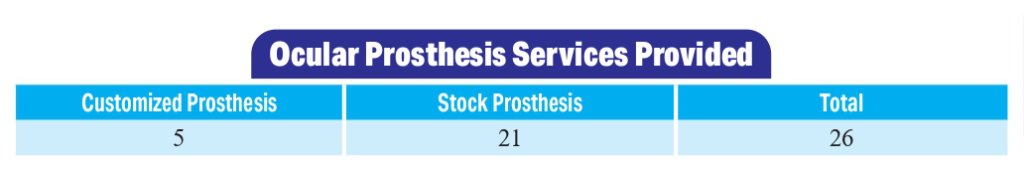 This unit established in 2080, operates under the Oculoplasty Subspecialty Department and has been providing ocular prosthesis services. During the fiscal year 2024–2025, a total of 31 patients (23 males and 8 females) visited the laboratory. Among them, 26 patients were successfully provided with prosthetic eyes. The department continues to deliver this specialized service with the objective of restoring the cosmetic appearance and enhancing the confidence of patients requiring ocular prostheses.