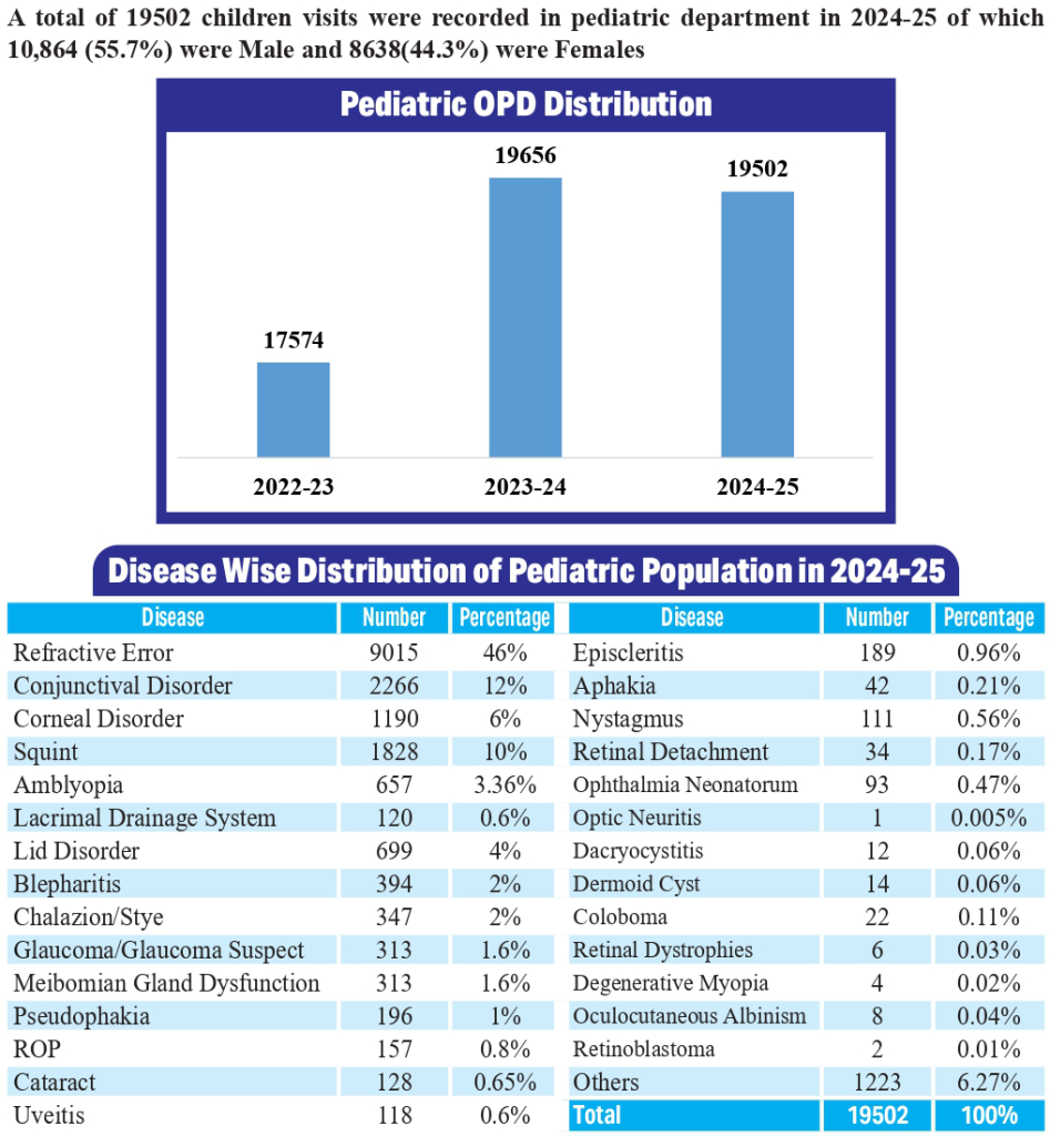 Pediatric Department was started as a separate department (0-16 years) on 2014, and it has come a long way in a decade. It started with 2 optometrist, now it has expanded its wings and proudly has its own Pediatric Ophthalmologist, an Optometrist, an Orthoptics and Orthoptic trainee.