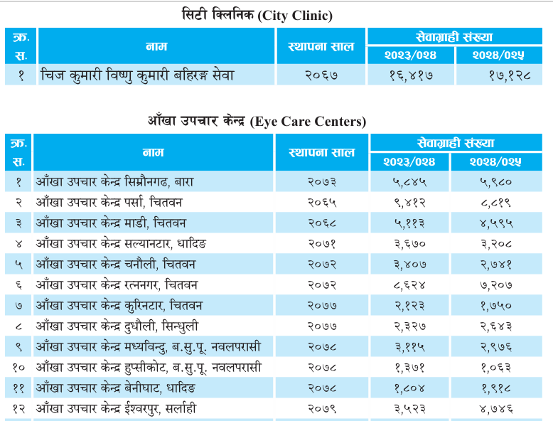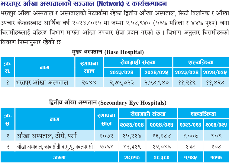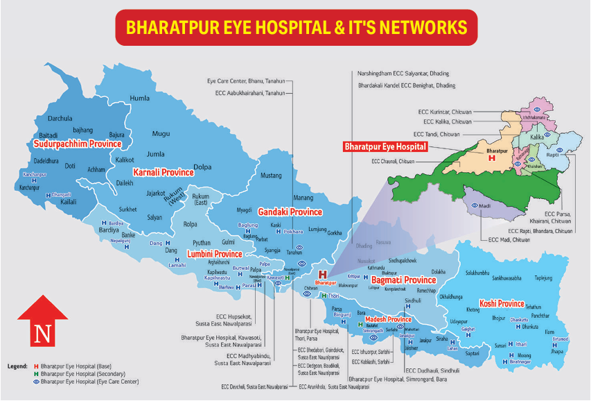 Bharatpur Eye Hospital; BEH (Hiralal Santudevi Pradhan Institute of Ophthalmic Sciences) is located in the Chitwan District of southern central Nepal. BEH is a non-profit making, charitable organization under the umbrella of Nepal Netra Jyoti Sangh (NNJS). Its objective is to provide high quality comprehensive eye care services at an affordable cost to local as well as patients from neighboring districts like Gorkha, Lamjung, Ba.Su.Pu. Nawalparasi, Tanahau, Makwanpur, Parsa, Dhading, Bara, Sindhuli & Sarlahi which comprises of about two million population. In addition to Base Hospital located at Bharatpur Metro Municipality, BEH has established 2 secondary level eye hospitals and 21 eye care centers at different places in its catchment area. Bharatpur Eye Hospital was established in 1987. The hospital building was constructed with financial and technical support from the Bank of Commerce and Credits International (BCCI) Foundation Pakistan. The hospital was inaugurated jointly by the Late King Birendra Bir BikramShah Dev and the President of Pakistan, Ghulam Ishaq Khan on 31 March 1988. This was the only one eye hospital named after king, which was changed after Nepal attained Republic in 2008. BEH has an academic wing known as Hiralal Santudevi Pradhan Institute of Ophthalmology and is conducting residency in ophthalmology and Anterior segment fellowship in affiliation with the National Academy of Medical Sciences (NAMS). Similarly, it is conducting academic programs like Bachelor in Optometry (B Optom) under NAMS.