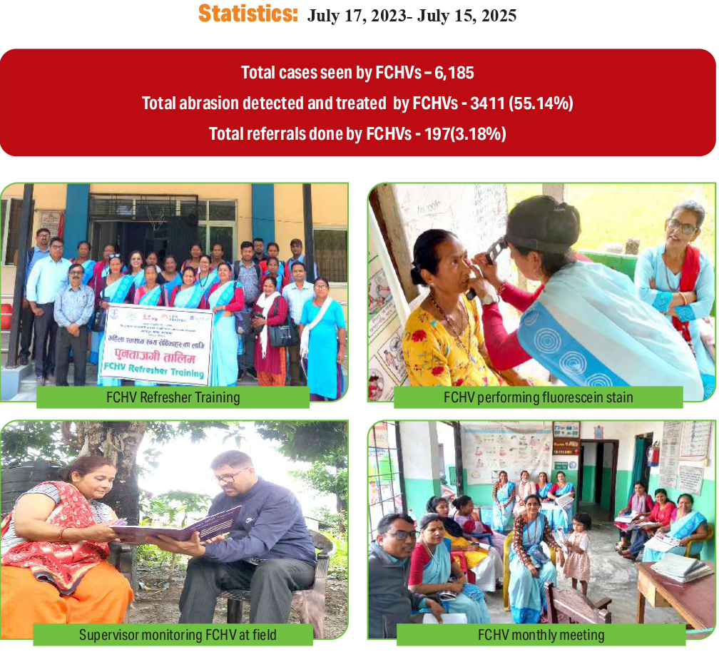 This aim to find the effectiveness of Female Community Volunteers (FCHVs) in preventing corneal blindness due to trauma. This was a three years study which ended in 2017 with the result that FCHVs intervention was effective in reducing corneal opacities due to ocular trauma in the rural communities than peri- urban or urban communities. Latter since September 2017 SightLife took this research as a corneal prevention program, where trained 117 FCHVs from 12 VDCs (Kathar, Kumroj, Birendranagar, Amarapuri, Pragatinagar, Devchuli, Agyauli, Deurali, Dhaubadi, Narayani, Nayabelhani and Kolhuwa) are involved in detecting and treating corneal abrasion due to trauma with prophylactic antibiotic ointment in their communities and appropriate referrals to eye care centers or eye hospitals. FCHVs are also trained to identify potential blinding diseases in the community and they take visual acuity with Snellen’s chart. Four field supervisors involved in monitoring those FCHVs. The HCP and SighLife International merged to create a new program called Cureblindness Project.
